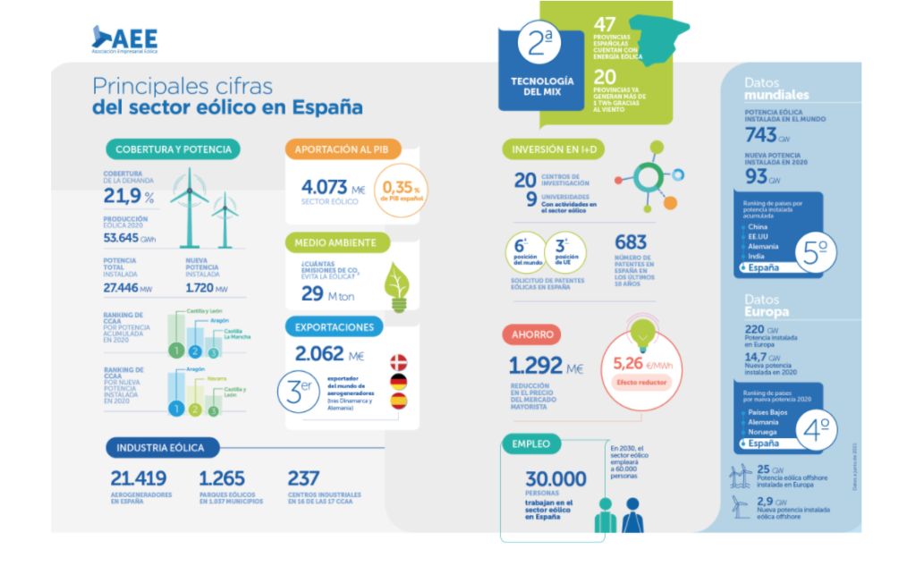 Pero no es la única ventaja que repercute a la sociedad. La eólica es motor de empleo. El sector emplea a 30.000 personas y se prevé que en diez años, la cifra llegue al doble, 60.000 personas. Las aportaciones al Producto Interior Bruto (PIB) alcanzan los 4.073 millones de euros, el 0,35%, y en términos medioambientales, la eólica evitó 29 millones de toneladas de CO2. Las exportaciones se situaron en los 2.062 millones de euros, y convierten a España en el tercer exportador del mundo de aerogeneradores, tras Dinamarca y Alemania. También ocupa posiciones de liderazgo por potencia instalada. Con un total de 27.446 MW, 1.720 MW nuevos, España permanece como quinta potencia mundial por potencia instalada acumulada detrás de China, Estados Unidos, Alemania, India y España.